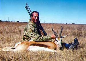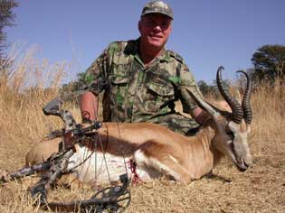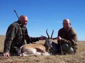 In former centuries great numbers of this pretty antelope ranged the high, open plains of the Karoo, where it occupied a place only comparable to that of the buffalo herds in the earliest days of North American History. Springbuck are normally gregarious, keeping together in troops of several hundred. Like other buck of the desert and semi-desert areas, springbuck rarely need to drink, though they visit water where it is available. In their natural state they dig out bulbs and succulent roots with their hoofs, and browse on the scanty herbage. A good buck stands about 33 inches (+-83 cm) high at the shoulder and weighs 70-80 pounds (30-36 kg). Both male and female carry horns, the female's being shorter and straighter than the male's. The general colouring is most attractive: pale reddish-brown above and white below, these areas being divided by a broad chestnut line along either flank. The face is white with a chestnut line down the cheeks. Both rump and short tale are white. |